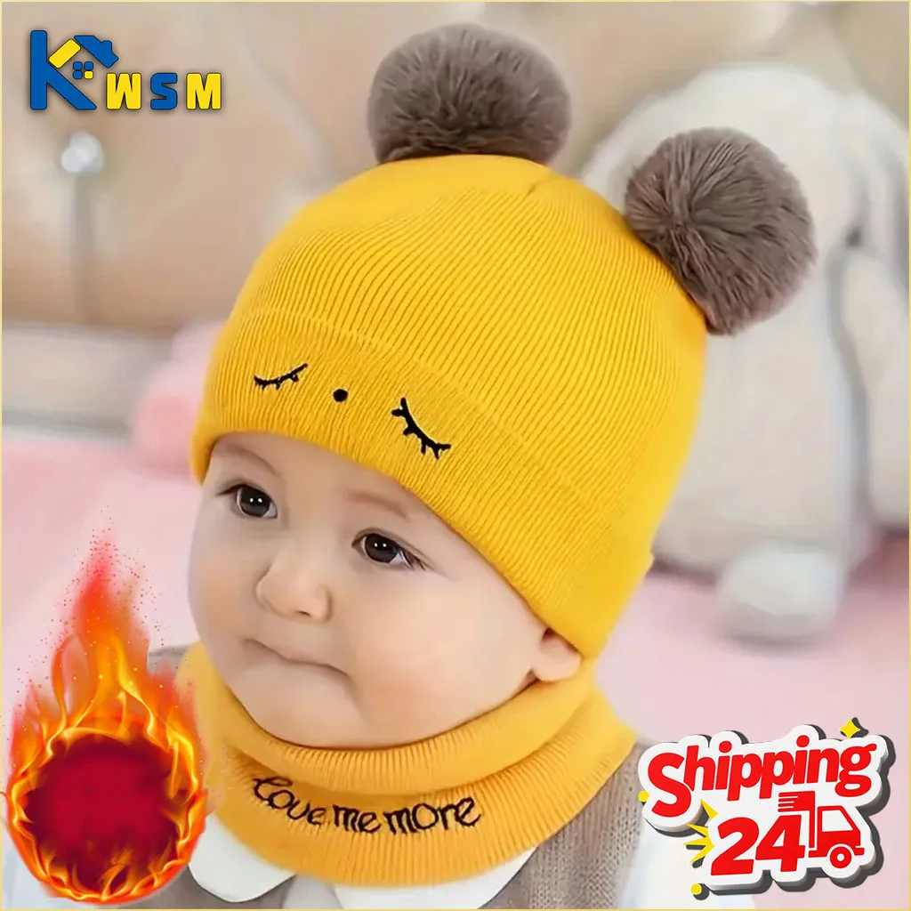 Autumn and Winter Knit Hat and Scarf Set with Pom Pom for Baby Boys and Girls Warm Windproof Neck Warmer Hats Christmas Gift