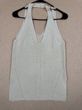 The product is a LUSH Women's Cream Knit Halter Top in size small. It features a V-neck, sleeveless design, open back, and a boho style. Made of polyester knit fabric, this pullover top is suitable for casual occasions during the summer and spring seasons....