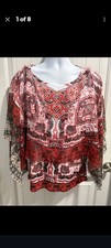 The Energe World Wear Top is a colorful and stylish women's XL blouse featuring a paisley pattern with a handkerchief hem. Made of polyester, this pullover top has a round neckline, kimono sleeves, and a regular fit. Suitable for travel, parties, or casual...