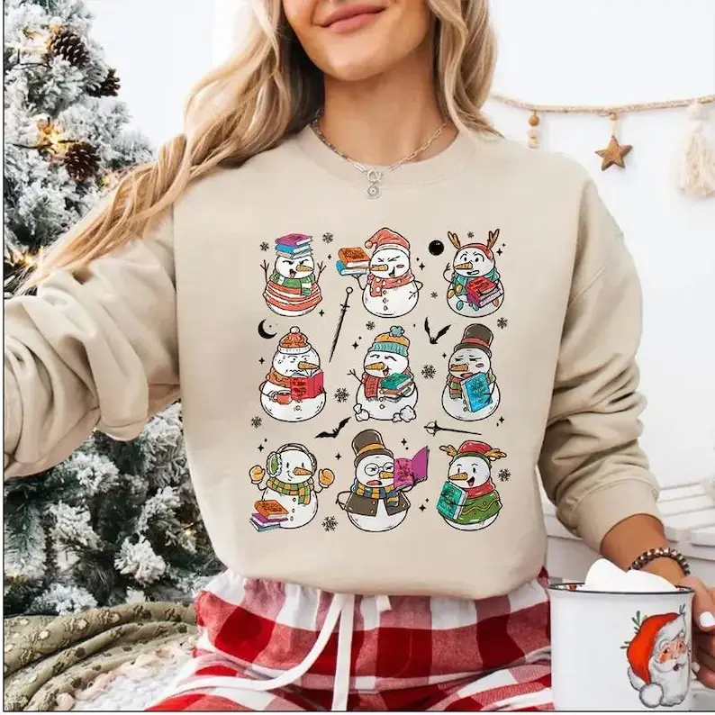 Book Lover Snowman Crewneck Sweatshirt Retro Christmas Gift Happy Lovely Snowman Pattern Long Sleeve Thermal Hoodie Sportswear