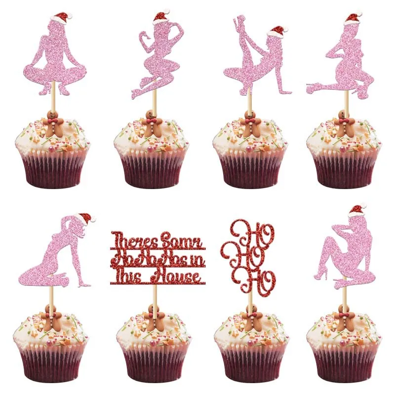 8pcs Glitter Pink Christmas Woman Cake Topper Christmas Party Cupcake Topper Xmas Dessert Decoration 2024 Noel Navidad Decor