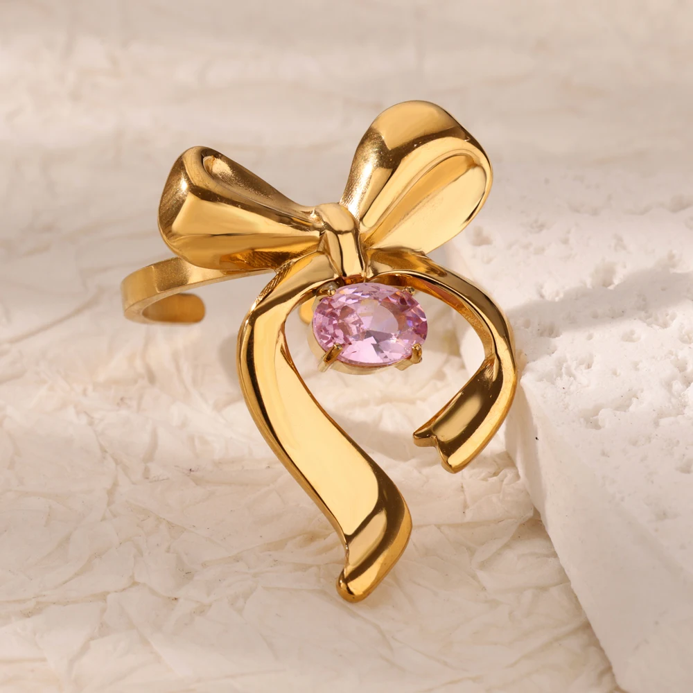 Bowknot Rings for Women Gold Color Stainless Steel Ring Pink Zircon Wedding Band Jewelry Unisex Christmas Gifts Freeshipping