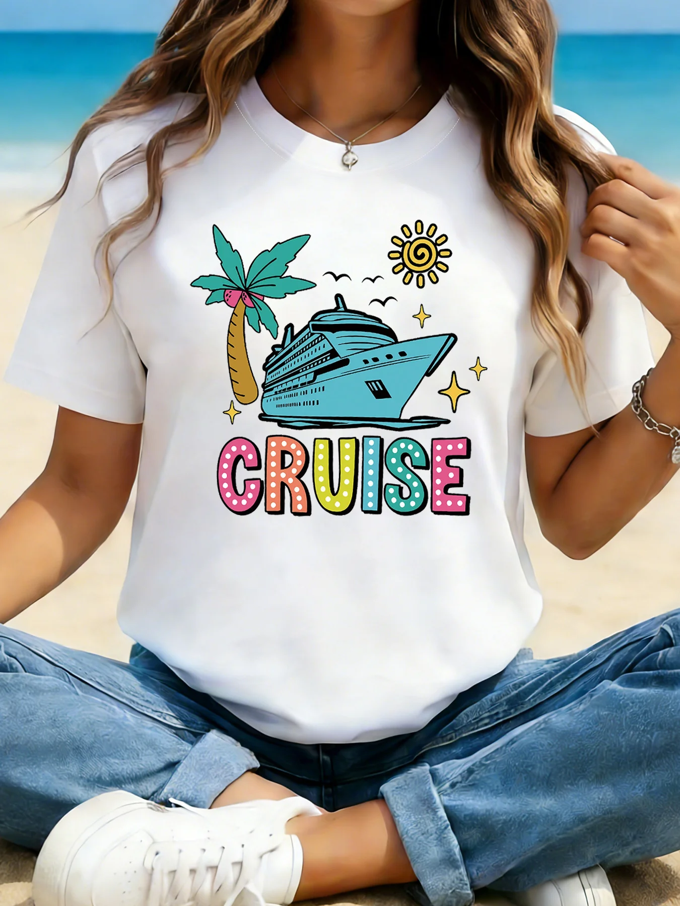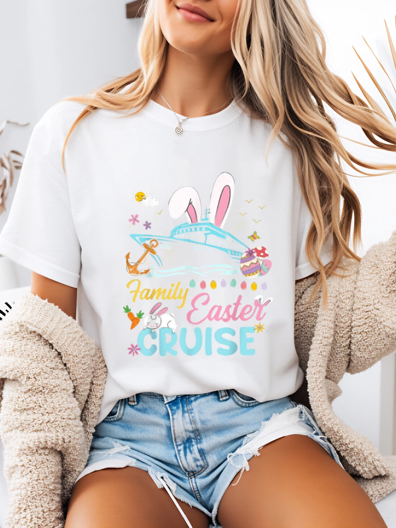 Easter Bunny Cruise Ship Family Easter Cruise Print T-Shirt Women Casual Spring Holiday Outfit White Plus-Size