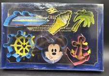 The Disney Cruise Line DCL Set of 6 Cookie Cutter Set features Mickey Mouse and a ship design, perfect for creating fun and unique cookies. This set is a vacation souvenir from a Disney Cruise, showcasing the beloved Disney character and theme. Made in Chi...
