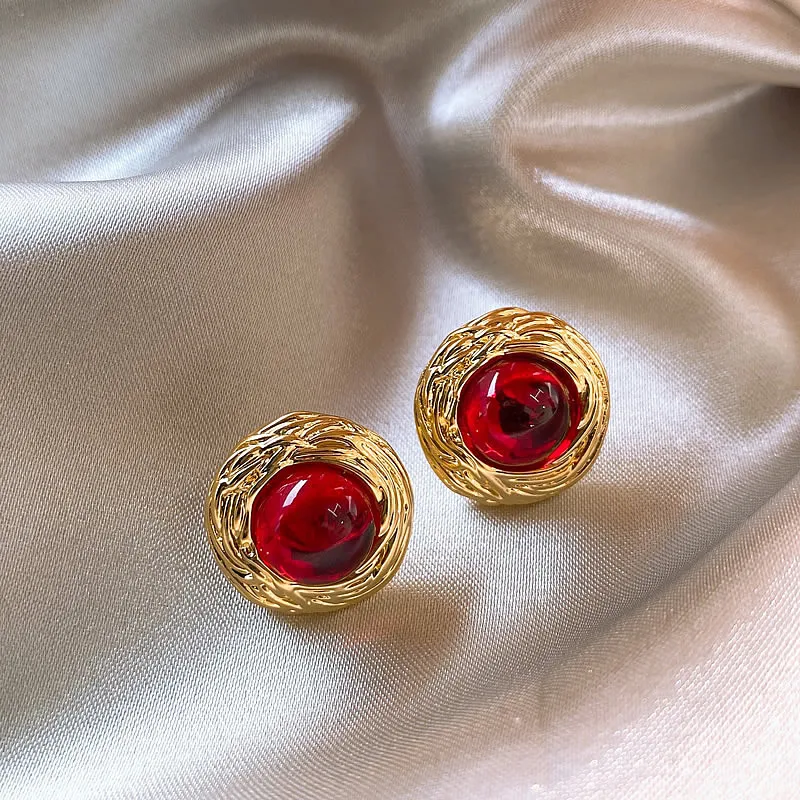 Retro Irregular Metal Red Rhinestone Circle Stud Earrings French Palace Style Charm Jewelry For Women