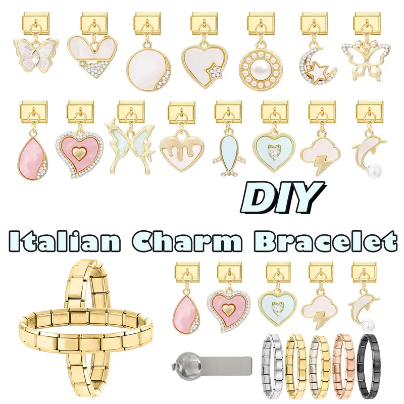 Gold Color Heart Moon Butterfly Fish Cloud Zircon Pearls DIY Italian Charm Links Fit 9mm Stainless Steel Bracelet Women Jewelry