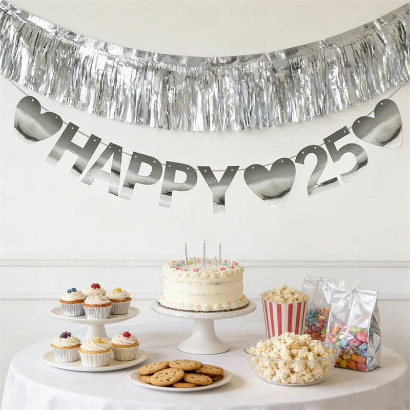 1Bag Silver Happy 25 Banner Birthday Party Decor Adult 25th Birthday Hanging Bunting Garland Wedding Anniversary Party Supplies