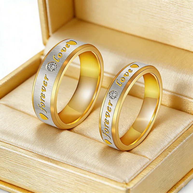 Stainless Steel Couple Wedding Bands Engraved Forever Love CZ Promise Rings Anniversary Valentine's Day Gift for Him Her Jewelry