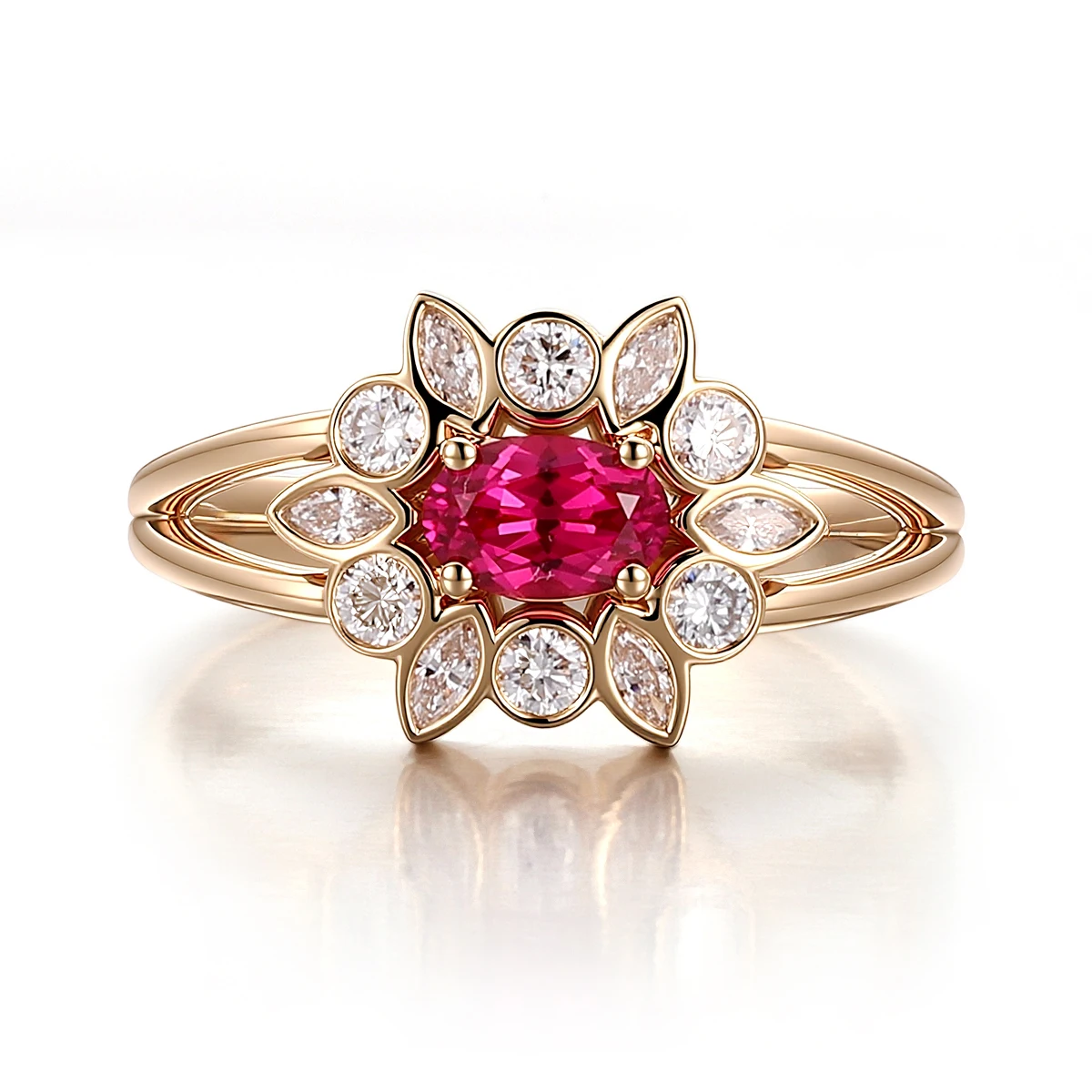 18K Gold Oval Lab Grown Ruby Floral Halo Ring Split Shank With Marquise And Round Moissanite Accents Vintage Jewelry for Her