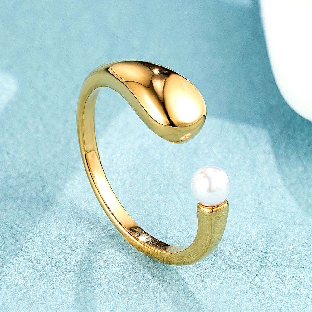 Elegant Women's Water Droplet Pearl Ring 18K Gold Color Plated Titanium Steel Fade-Resistant Jewelry Unique Design Gift for Her