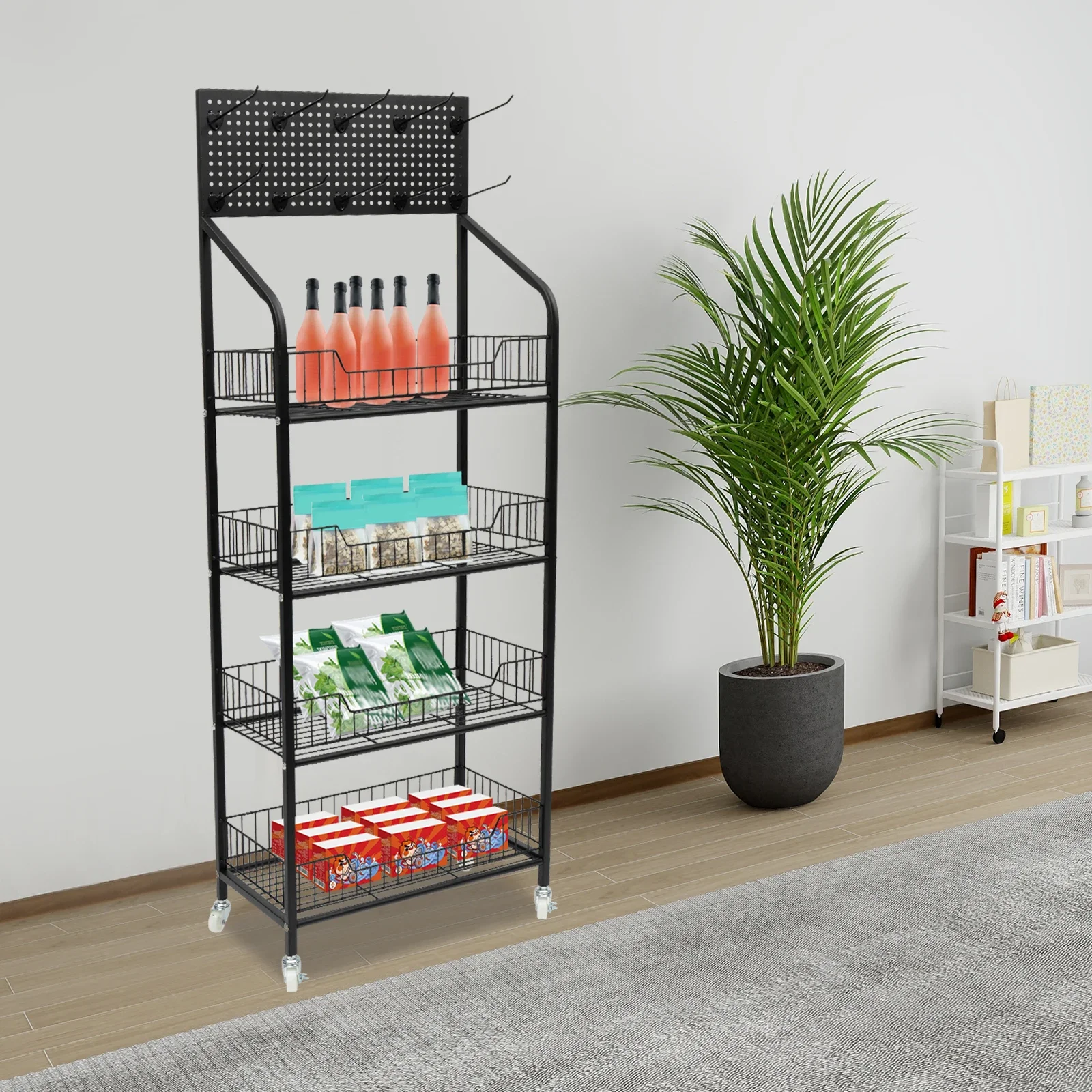 Retail Candy Snack Display Rack 4-Tier Metal Wire Storage Shelf Stand with Wheels,Hooks and Fixed Adjustable Feet Tiered Store