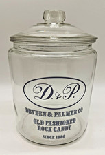 Vintage Dryden & Palmer glass candy jar with lid. Made from thick glass. The blue lettering remains crisp and clean. Small amount of blue flecks around lid area. I did not attempt to remove. Small imperfection on inside of lid. Can feel a bump from inside ...
