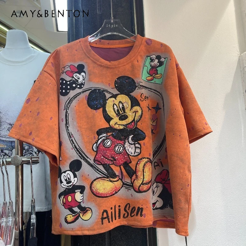 Korean Style 2026 Spring Summer Cartoon Print Black T-shirts Chic Versatile Short-sleeves Y2k Sweet Cute Tee 5 Colors Can Choose