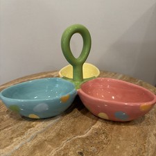 The Boston Warehouse 3 Section Polka Dot Egg Shaped Serving Dish is a charming and stylish addition to any table setting. Made of ceramic, this candy dish features a fun polka dot design and an egg-shaped design, making it both practical and decorative. Wi...