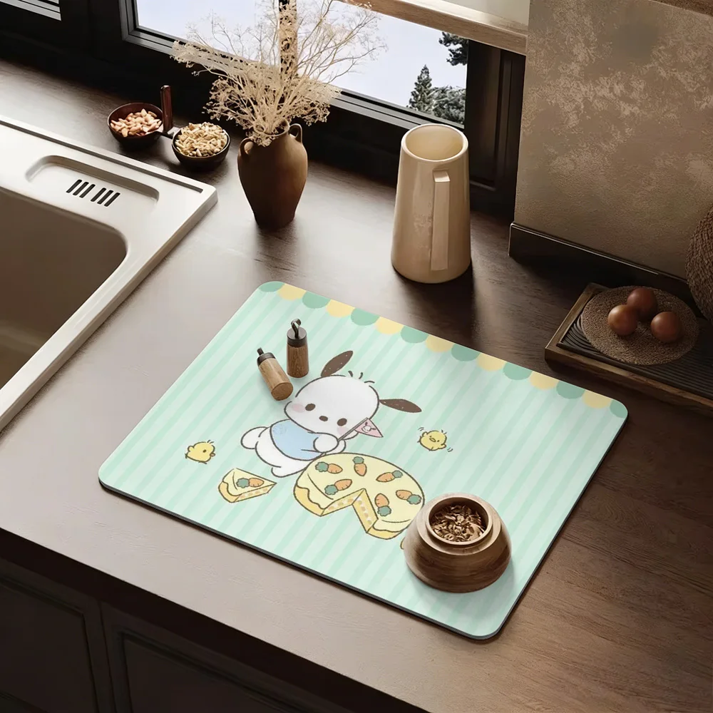 Pochacco Carrot Cake Green Stripe Print Dish Drying Mat Non-Slip Washable Absorbent Kitchen Counter Pad