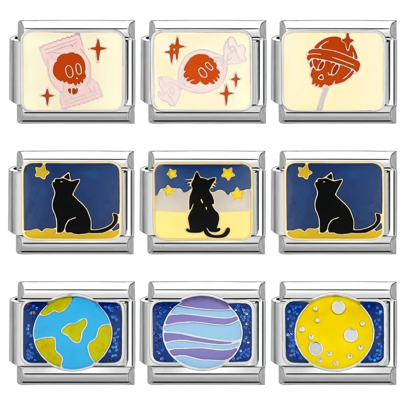 Halloween Skull Candy Cartoon Cute Night Black Cats Planet Beads Fit 9mm Italian Charm Bracelet Stainless Steel DIY Gifts