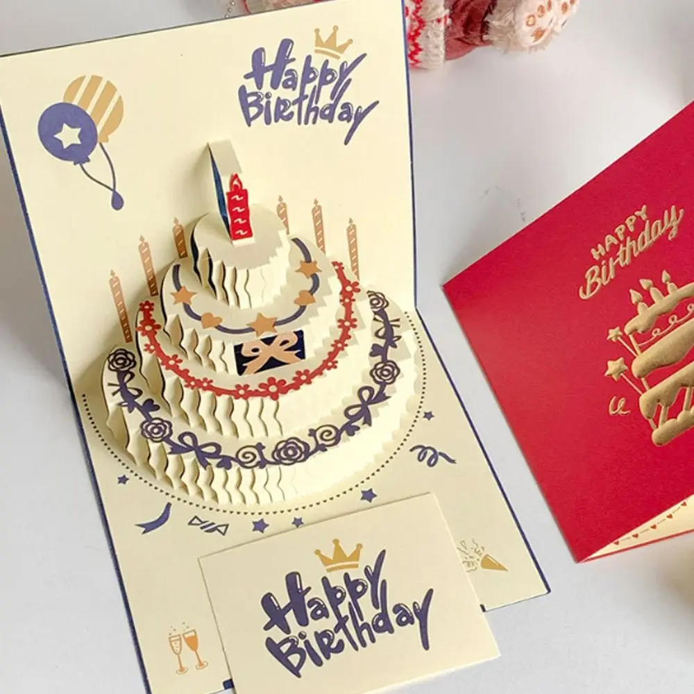 Folding 3D Happy Birthday Card Four-Layer Cake Postcard Pop-Up Greeting Card Paper Blessing Gift Message Cards Birthday Party