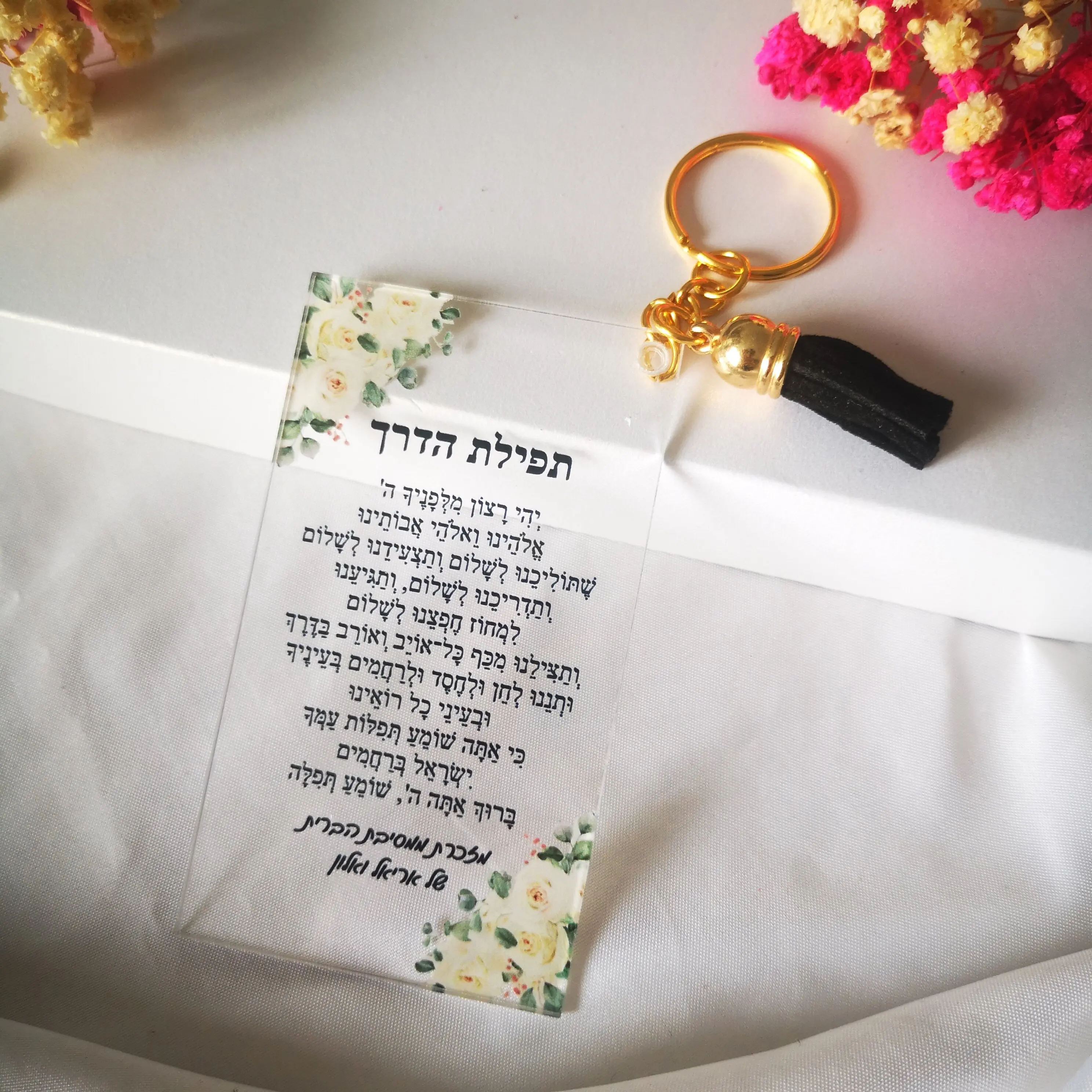 Pink Flower Bar Mitzvah Custom Hebrew and English Plexiglass Small Print Cards, Wedding Party Guest Souvenir Gift Keychain