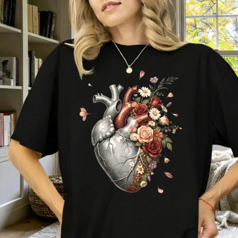 Floral Adult T-Shirt Unique Anatomical Heart Art Valentines Day Gift for Doctors Medical Student Crewneck Regular Short Sleeve