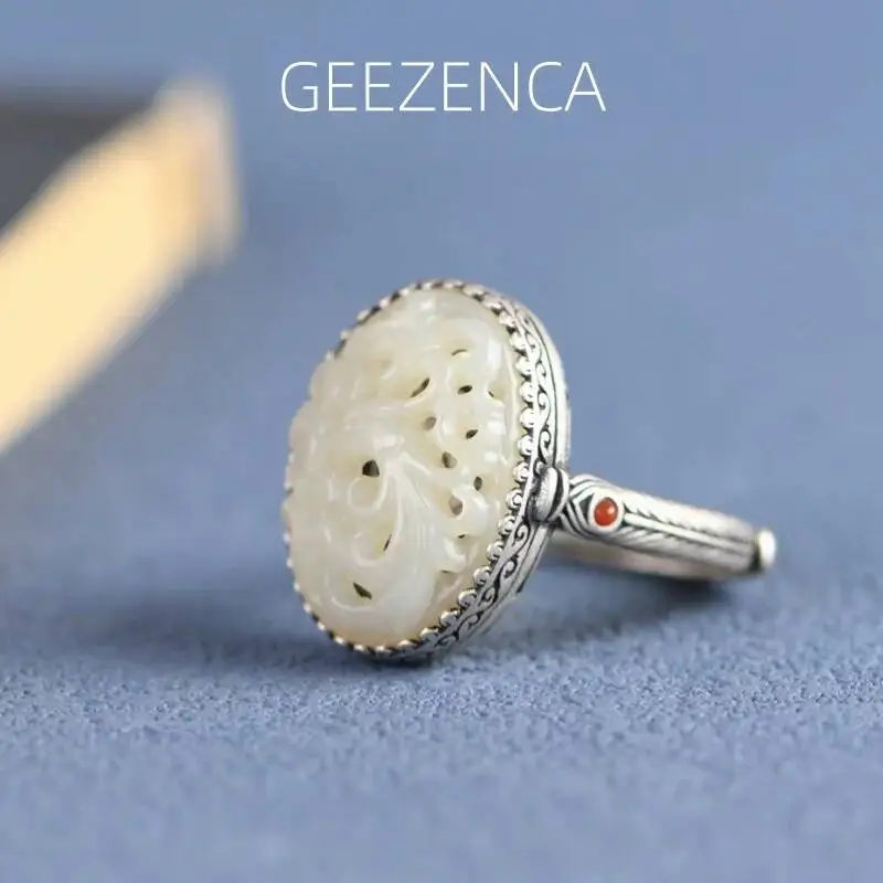 GEEZENCA 925 Sterling Silver Carved Jade Sizable Ring For Women Luxury Handmade Unusual Peony Flower Locket Openable Rings Gift