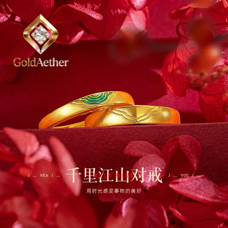 GoldAether 9999 24K Real Gold The Journey of a Legendary Landscape Painting Pair Ring Couple Lovers Rings Adjustable Enamelgift